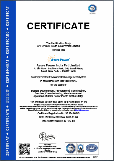 Solar power sustainability at Azure Power means providing clean and affordable renewable energy solutions while safeguarding the health and well-being of our people and giving back to our environment and communities in a socially responsible manner.